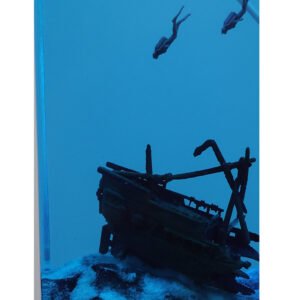 dive into a frozen fathom. Hand-poured layers of crystal resin trap a ghostly galleon split by time, its tattered sails and barnacled cannons glowing beneath soft aqua LEDs. Micro-bubbles drift like lost memories